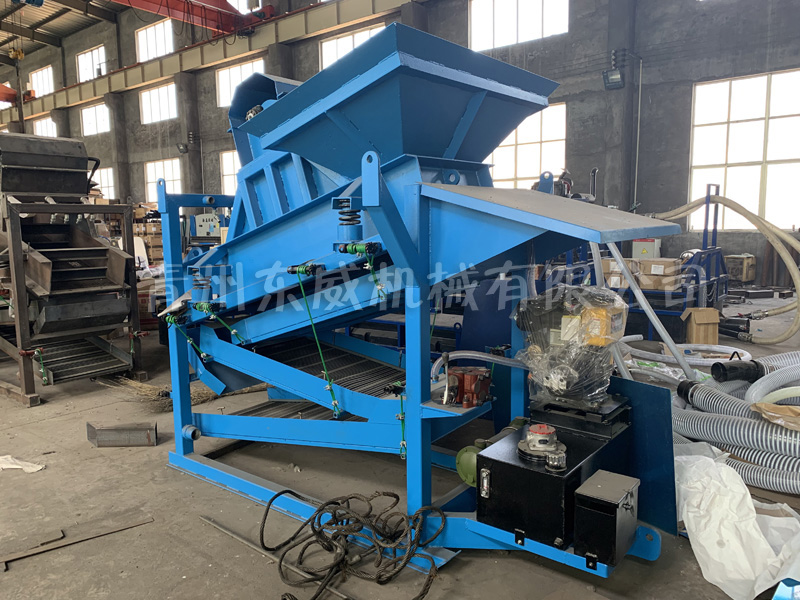 振動式選金機(jī)是一個(gè)緊湊型、可移動的整體結(jié)構(gòu)。頂部為篩條部分,可以將大塊物料隔除,同時(shí)物料落入二次篩分機(jī)構(gòu),充分篩分后,高壓力水將沙子沖入溜槽選金。該選金機(jī)結(jié)構(gòu)金緊湊、操作簡單、低運(yùn)行成本。明顯比市場上其它選金設(shè)備有優(yōu)勢,無需豐富的選金經(jīng)驗(yàn)即可操作。
